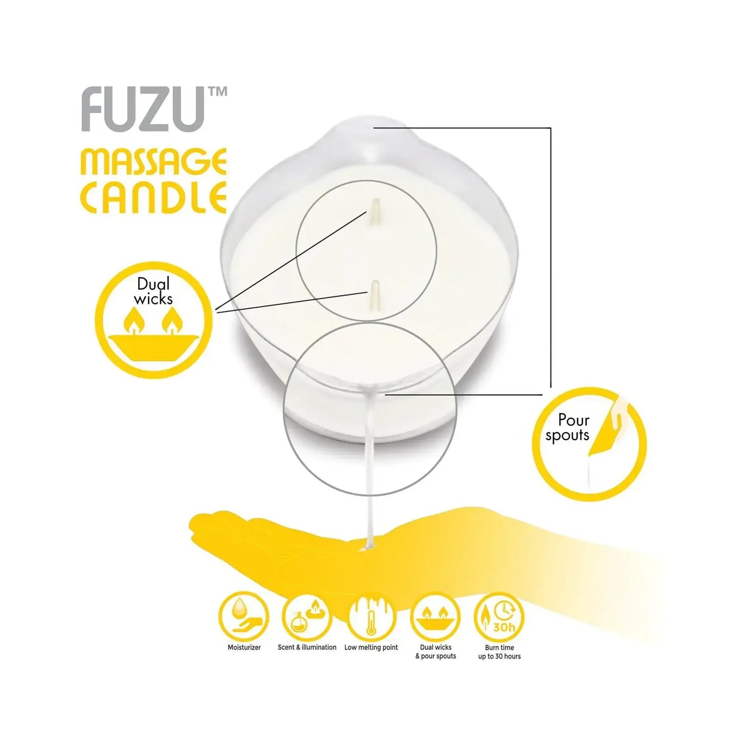 Enjoy a peaceful pampering experience with the soothing warmth of the Fuzu massage candle. Let the wax melt into a luxurious warm massage oil and skin moisturizer with a delicious date and lemon scent. Engage the senses and liberate the body and mind of daily pressures. Convenient pour spouts and dual wicks allow for easy application.