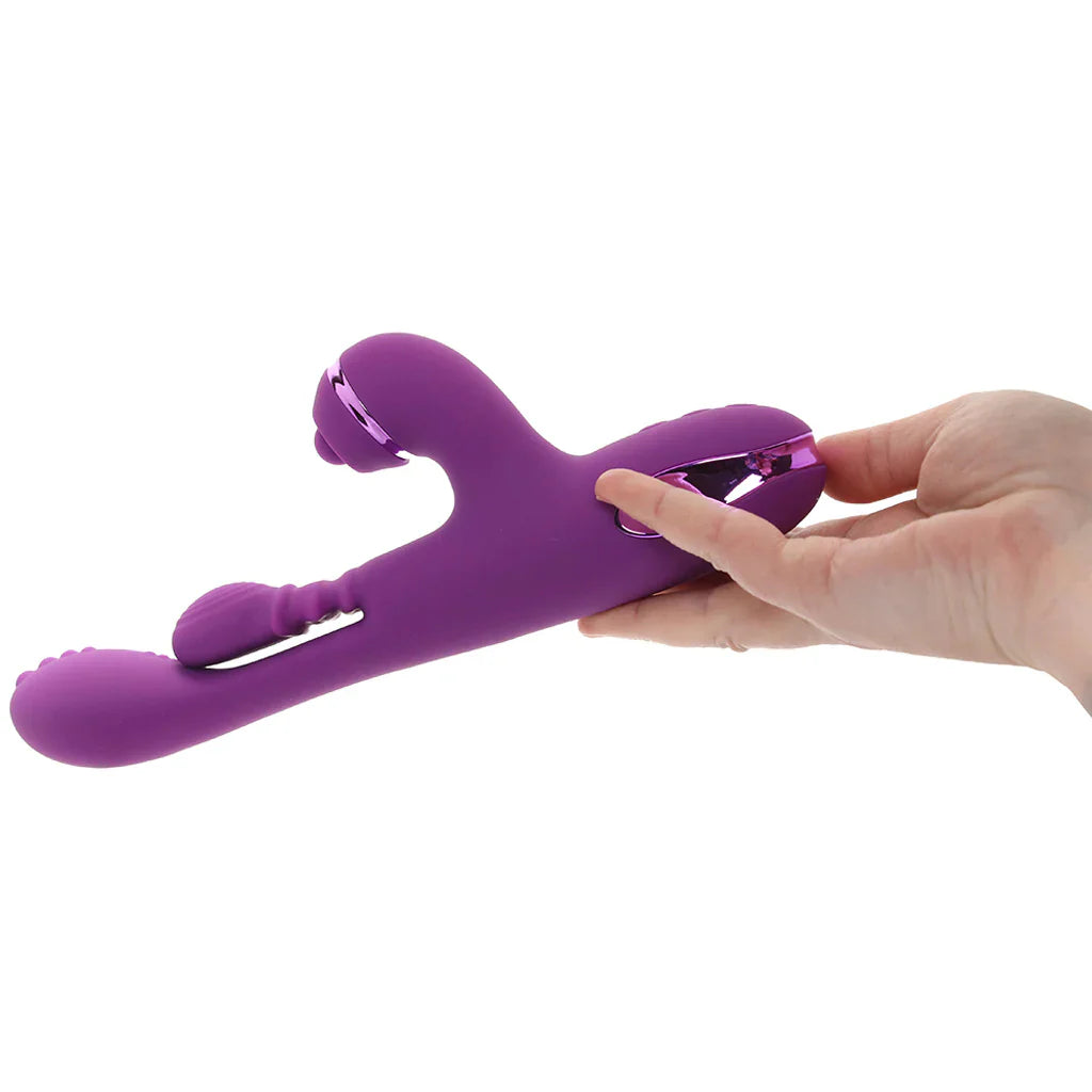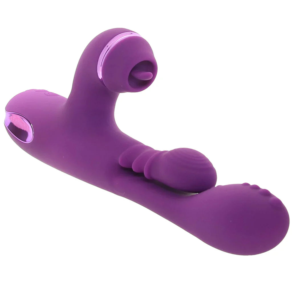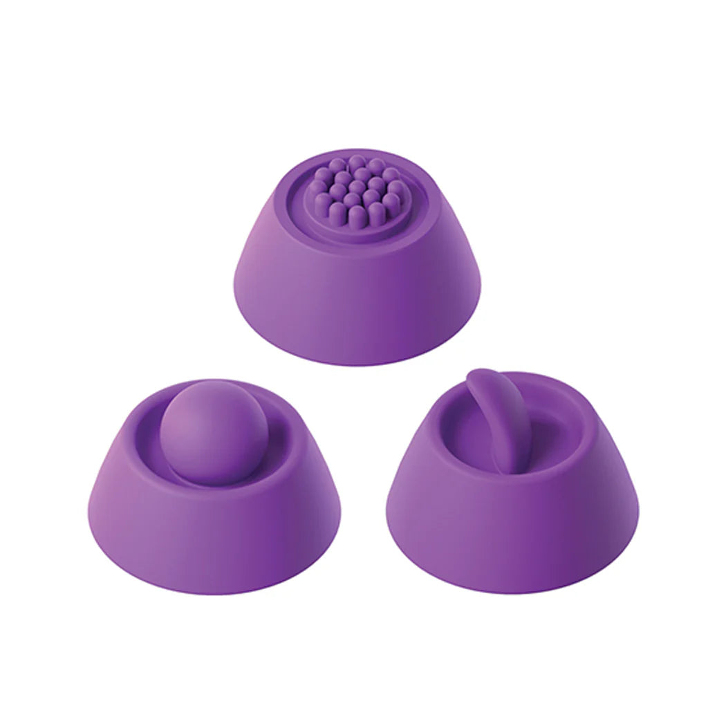 But that's not all! Below the penetrator and finger, you'll find the fabulous FlickerFlow teaser. It reaches up to surround clits, lips, and outer pleasure places with yet another ten modes of focused vibration. Pop three silicone attachment tips on and off for always different sensation situations.