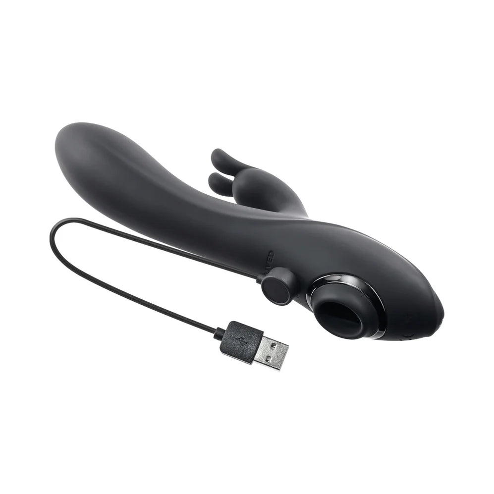 This hard-working triple-threat toy delivers three powerful experiences in one elegant shape. The flexible 10-speed main shaft gently curves and swells to a G-spot tip with circular textures at the head while the tireless 10-speed rabbit stimulator bops and bends with your body for intense stimulation. Flip the toy over for a glorious 3-speed suction sensation that pulls and teases, building to an erotic climax. Keep an easy grip with the textured handle and recharge magnetically via USB. Splashproof and easy to clean.