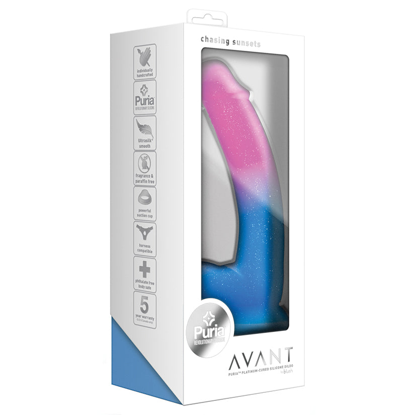 Moderno, elegante y hermoso: ¡conoce el Avant Chasing Sunsets! Este exclusivo dildo artesanal tiene un efecto degradado de colores brillantes y un sutil brillo que le dará un toque mágico a tus juegos. Su resistente base con ventosa se puede fijar a cualquier superficie plana y limpia para jugar con las manos libres, o es compatible con arnés para disfrutar en pareja. Chasing Sunsets cuenta con la suave y sedosa UltraSilk y está hecho de silicona Puria curada con platino, lo que lo hace seguro para el cuerpo y libre de ftalatos, parafinas, fragancias y látex. Hermoso y diseñado pensando en tu placer, ¡es hora de empezar a disfrutar de Chasing Sunsets!