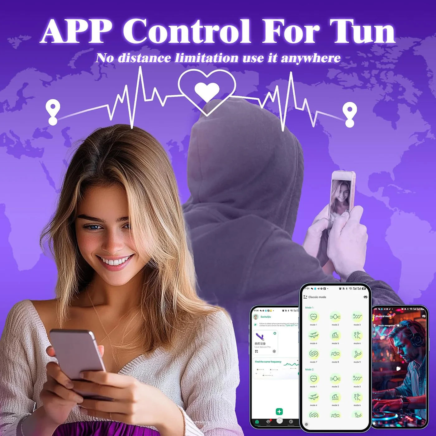 • Control remoto por aplicación y decibelios silenciosos : Con control remoto y aplicación, este juguete sexual vibrador femenino te permite controlarlo mediante control remoto inalámbrico o aplicación. El control remoto tiene un alcance de hasta 11,5 metros. Si tú y tu pareja están separados por la distancia, ¡no te preocupes! Simplemente descarga la aplicación en ambos teléfonos y conéctalos por Bluetooth. Tu pareja podrá controlar el juguete, permitiéndoles compartir la diversión dondequiera que estén. Los bajos decibelios y niveles de ruido mantienen tus secretos a salvo.